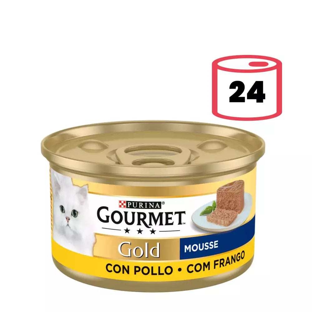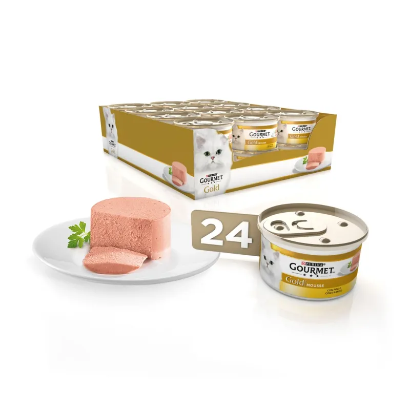 La comida húmeda para gatos de Purina Gourmet Gold es un mousse de pollo que ofrece a tu felino amigo una alimentación completa. Posee un alto contenido de pollo para mantener a tu gato con un suministro adecuado de proteínas que lo mantendrán activo y saludable. Además, su suave textura crea un alimento que tu mascota no podrá resistir.